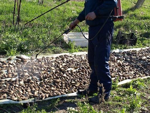 The photo shows the processing of seed potatoes before planting (from the Colorado potato beetle).