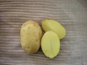 - The root crop is an elongated oval tuber, the eyes are very small, the peel is earthy yellow, slightly rough, the pulp is pale yellow inside, in the center a vein one tone darker than the pulp may appear.