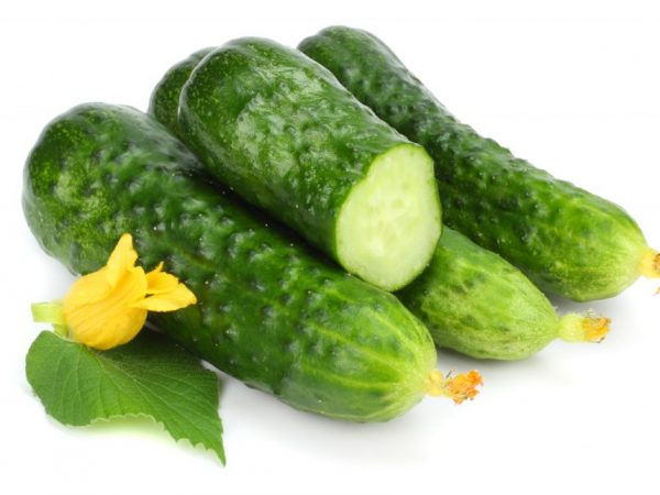 The fruits of the Dirigentne variety are large, up to 15 cm in length and up to 80 g in weight. Their size practically does not change during the entire ripening stage. In one fruit node 2-3 cucumbers are formed. The skin of the fruit is dark green, thin, bumpy. There are short yellow stripes on the surface.