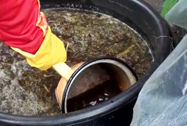 - The finished liquid is diluted with water for irrigation. A 10-liter bucket needs a liter of green mash.