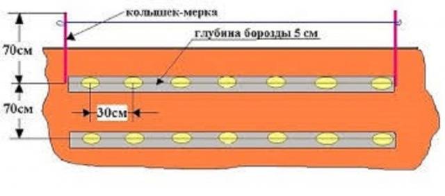 The depth of the furrows, which are made on the ground, is 5 cm. The arrangement of the rows is at least 70 cm from each other, and the distance between the tubers is 30 cm. But look at the number of shoots. The more there are, the longer the distance between the tubers must be maintained.