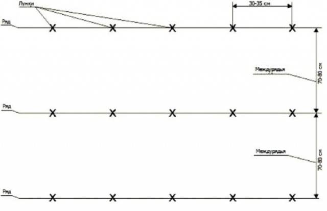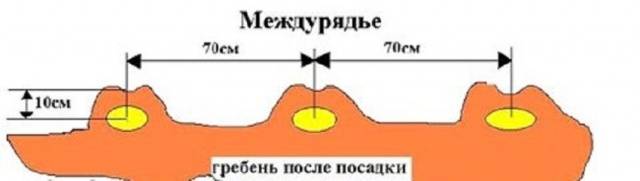 A common method for a long time. Layout of tubers 70x30. With this method, they dig up a selected part of the site, outline even furrows with a cord and lay them with a depth of 5-10 cm. Humus (0.5 shovels) and wood ash (1 tbsp. Spoon) are introduced into the furrow. The dose is repeated every 30 cm of the furrow. Potatoes are laid on top and covered with earth. It is best to do this on both sides to create an M-shaped comb. The height of the comb is 9-10 cm, the width is about 22 cm.