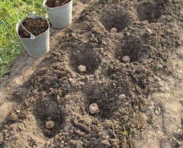 The site for planting is dug up in the fall, mineral and organic fertilizers are added. In the spring, the beds are marked, leaving an interval between the rows of at least 70 cm. In early spring, in dry weather, ridges with a height of 15 cm are formed. The planting material is laid out in rows, sprinkled with earth and spilled abundantly.