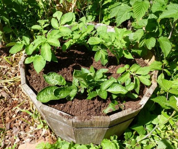 At the bottom of the barrel, 20-30 cm of drainage is poured, which is covered with 30 cm of prepared soil. Put the potatoes in a barrel, sprinkle 20 cm with soil. As it grows, sprinkling with soil is repeated until the barrel is full.