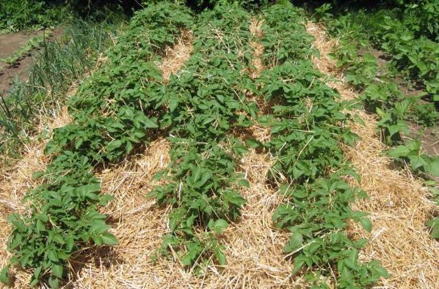 In the spring, holes are made for planting. The depth should be about 30 cm, the distance between them is at least 40 cm. The holes are placed in a checkerboard pattern. After planting potatoes, the soil is mulched.