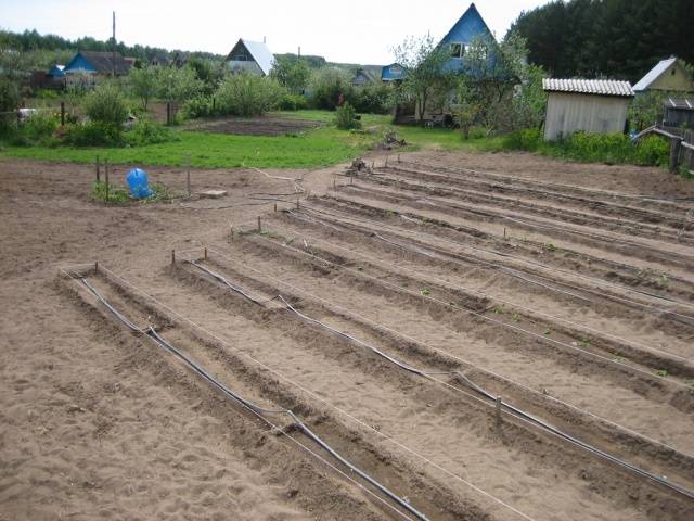 In the spring, the beds are marked, along which the tapes for drip irrigation are laid out. The places where the tapes are located are marked outside the site.