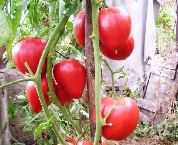 The fruits of tomatoes are always large in size, typical of the Walford variety, heart-shaped. Tomatoes are lightly ribbed and dense. Unripe fruits are light green in color with a dark spot at the base of the stalk, ripe fruits are bright red or scarlet. In the context of a fleshy flesh of a pinkish hue with 4-5 cavities.
