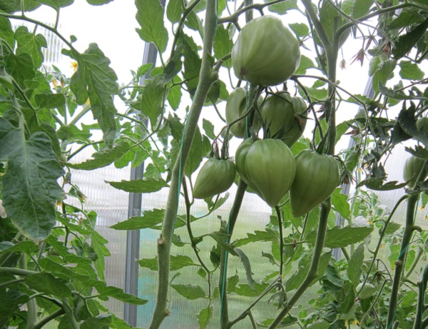 In a dry summer, to retain moisture, the bases of tomatoes are mulched with small or large sawdust, hay. As the soil subsides, hay is added 2 times per season. It will also protect the bushes from extreme temperature changes. To obtain a large harvest before flowering, adult bushes are pinched or pinched, then the bush is formed into 2 main stems. The stem is tied up with wide cloth bandages on a trellis. You also need to tie a garter under each large tomato.