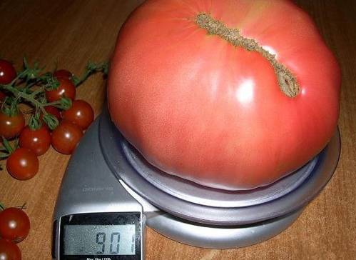 Tomatoes are large, on average about 500 grams. Fruits on the first tassels are always larger, often grow to a kilogram. Please look at the photo below, here is the fetus on the scales.