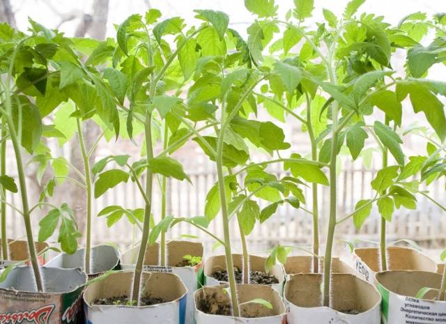 If the tomatoes were planted in boxes, then with the development of 2-3 leaves, they are dived into separate cups. The procedure can be avoided if the plants are already in separate containers.