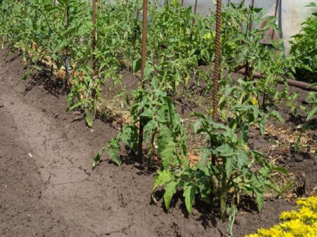 For planting in the soil, make holes corresponding to the size of the root system at a distance of 35 cm from each other, spill them with a solution of a root growth stimulator (2 - 3 tablespoons per 10 liters of water) with a temperature of 35⁰С. The tomato is laid on its side, with the crown to the north. This method allows you to increase the volume of the root system due to additional roots. In two days, the seedlings will rise. The soil should reach down to the lower leaves. For 1 sq. m place up to 6 plants.