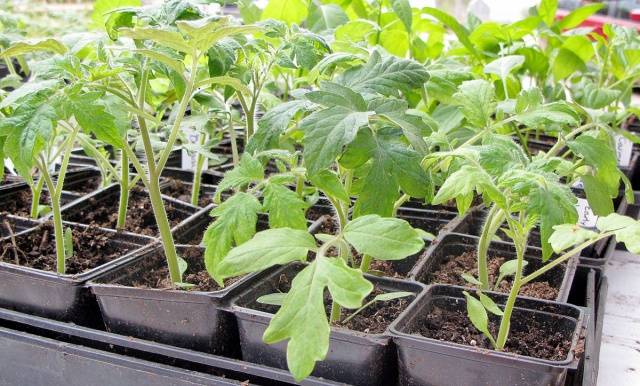 Tomatoes are watered by spraying with warm, settled water. When 2 leaves appear, the tomatoes are seated in separate containers with a capacity of 0.5 liters or more.