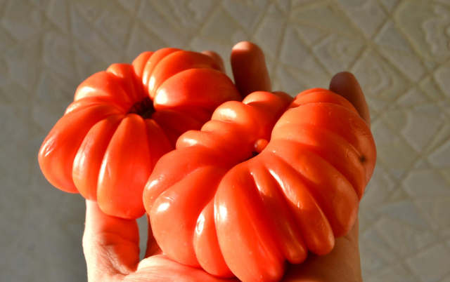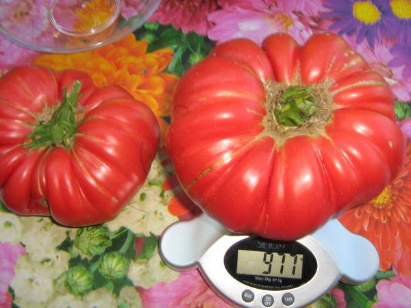 Tomato "Japanese crab" can be called the best among many other varieties. It is distinguished, first of all, by its interesting, bright taste and aroma. The variety is ideal for making salads, sandwiches and other cold snacks. Large vegetables are very fleshy and contain little free juice. Their average weight is 300 g, but some especially large fruits reach a mass of 800-900 g. The giants of the "Japanese crab" variety can be seen in the photo below: