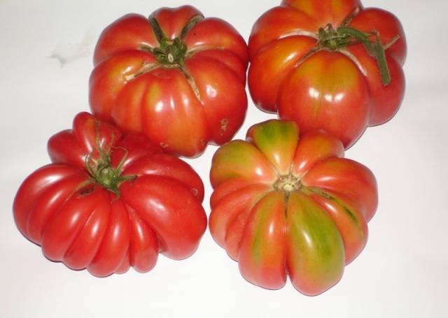 Tomatoes of the "Japanese crab" variety are flattened, their surface is ribbed. There are 5-6 small seed chambers inside the tomato. The color of vegetables changes as they ripen from green to bright red or crimson. A dark spot typical of this variety can be seen near the stem of the tomato.