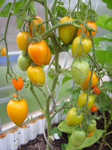 The size of the fruits of this variety is small, on average they weigh from 90 to 110 grams. They grow in the form of brushes, each of which contains from four to eight tomatoes.