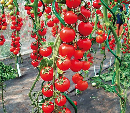 Indeterminate cherry trees bear fruit with both open and closed cultivation. Intensively developing bushes can grow up to 5 m in height.Some hybrids form clusters so large that even large-fruited tomatoes cannot compete with them. You can save the brushes from breaking off under your own weight only by carefully tying them to the trellis.