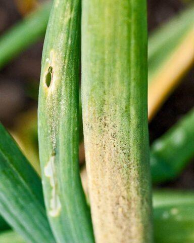 - Thrips. These small pests feed on plant sap, leaving extensive black spots on the leaves. You can get rid of parasites by treating onion plantings with Aktellik or other insecticides.