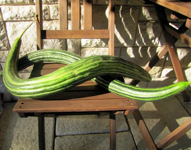 Fruits are oblong. The color is light green. There is a slight drop in a silvery shade. The length of the serpentine melon reaches half a meter. Weight 1 kg. However, there are specimens weighing up to 6 kg. Unripe fruits are bright green in color. A sign of ripeness is the appearance of a yellow color. The skin becomes thinner. The surface acquires an uneven, rough texture.