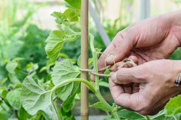 The snake melon does not need pinching and pinching. To prevent the serpentine fruits from lying on the ground, wooden trellises are installed. Vertical supports are installed on opposite edges of the beds. A string is pulled between them, to which the twine lowered down is attached. The shoots are directed to grow on them. This contributes to better ventilation, illumination and less contact of the plant with the soil.