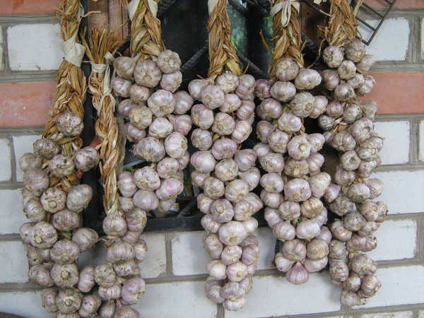 Garlic is harvested carefully, without damaging the head, do not pull out, but dig it out. Then they are dried on the street in the shade with the onion down.