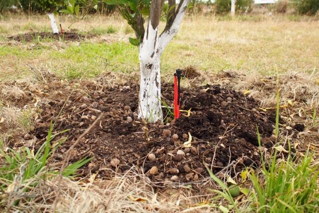- Small depressions are prepared in the soil around the trees, where fertilizer is embedded.