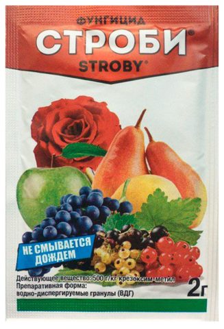 - Strobe. The drug is produced by the German company "Basf Agro".The active substance is kresoxim-methyl, the inhibitory effect of which blocks the proliferation of spores and prevents the further spread of the disease. This fungicide is effective even in humid conditions.
