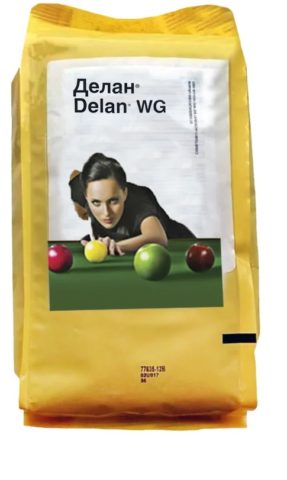 - Delan. A universal preparation of contact action from the German company "Basf", which, when processed, creates a protective layer on the surface of the plant that suppresses the growth of spores. The active substance - dithianon, acts simultaneously on most of the enzymes of the fungus, which excludes the appearance of resistance.