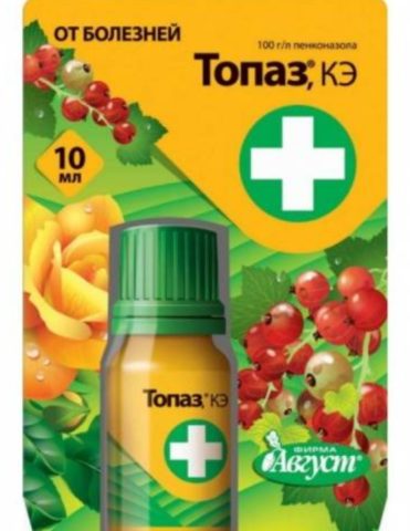 - Topaz. Swiss drug from the Syngenta company. It has a systemic and curative effect. The greatest efficiency can be achieved when processing is carried out at the beginning of the growing season to suppress the primary infection of powdery mildew. The active ingredient is penconazole. The protective effect of the drug lasts for 2 weeks.