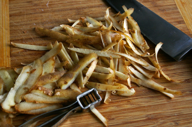 Fertilizer preparation according to this principle involves short-term infusion of the peel in water and further processing of raw materials into a homogeneous mass. Potato peelings are washed with water, then scalded with boiling water to remove possible harmful organisms. They are then dried and stacked tightly in large glass jars or food grade plastic buckets.
