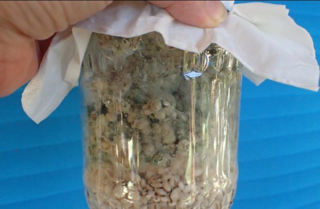 The container is placed in a dark and warm place and checked periodically. White bloom on the pearl barley will appear in a couple of days, and when the mycelium from the cereal turns completely green, it can be used for processing.
