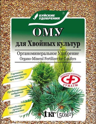 Improves the agrophysical properties of the soil, its structure, as well as water and air permeability. The composition of this universal complex is distinguished by a high content of potassium (11%) and a reduced content of phosphorus (4.2%) and nitrogen (4%). When planting conifers and shrubs, from 90 to 100 g of the drug are applied to each hole. In the case of feeding WMD, Coniferous is introduced with the onset of spring, then in July and early autumn at a dosage of 25 to 30 g per m22.