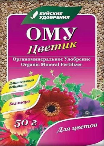 The universal tool OMU Tsvetik is used as the main dressing for the soil when transplanting balcony and indoor flowers, as well as for feeding plants.