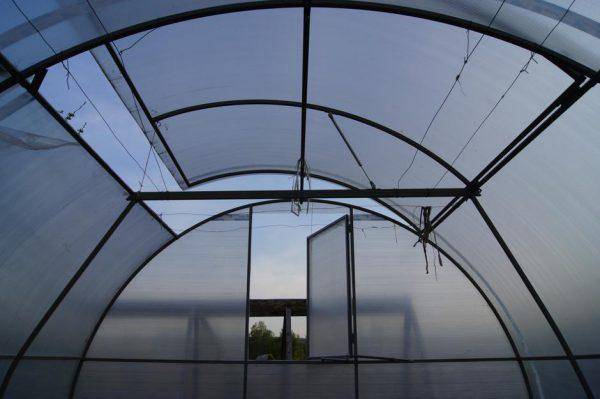 For covering a greenhouse with arched roof polycarbonate is the best, one might say, the only material. Transparent sheets are elastic. It is easy for them to give the shape of a semicircular arch. The light weight of the sheet allows one person to work with polycarbonate. The high strength of the material withstands snow loads, but due to the semicircular shape, precipitation on the roof does not accumulate. The advantage of the arched structure is that condensate flows down the walls, and it does not fall on the growing plantings.The disadvantage of a semicircular roof is the impossibility of growing tall plants. This is due to the impossibility of installing ventilation windows on the long sides of the greenhouse.
