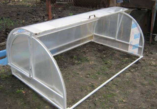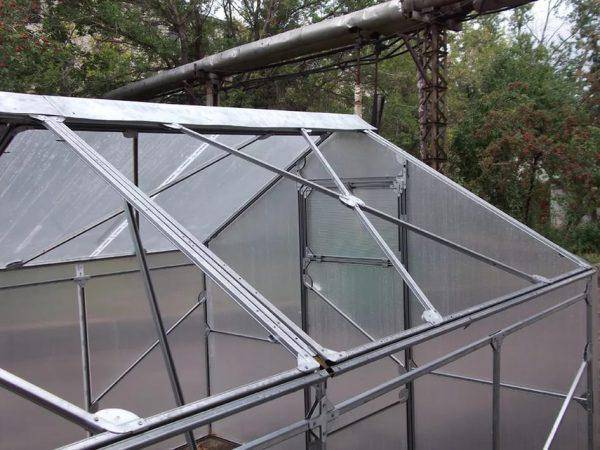 A shelter with any shape of the roof can be made independently and sheathed with polycarbonate. Opening doors are made on hinges or buy a factory-made mechanism. If desired, a ready-made polycarbonate greenhouse with an opening top can be bought in a store. Its frame is quickly assembled according to the attached scheme and sheathed with polycarbonate.