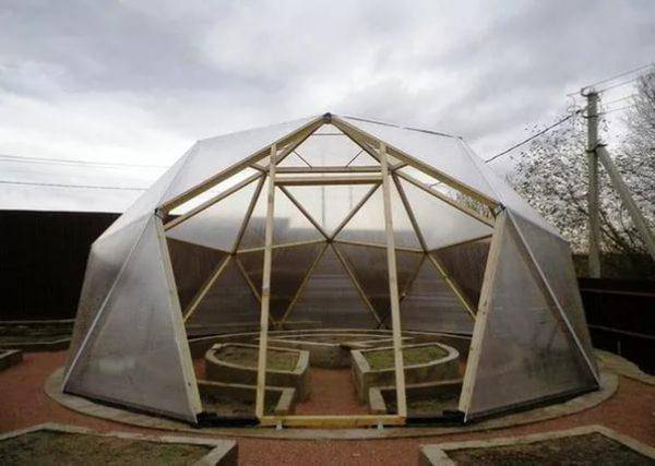 Dome shape a greenhouse or greenhouse is made up of triangular segments. Each element, sheathed with polycarbonate, creates a refraction of light rays, which ensures its diffusion inside the greenhouse. The sash can be made so that the roof is fully, if necessary, open or partially ajar.