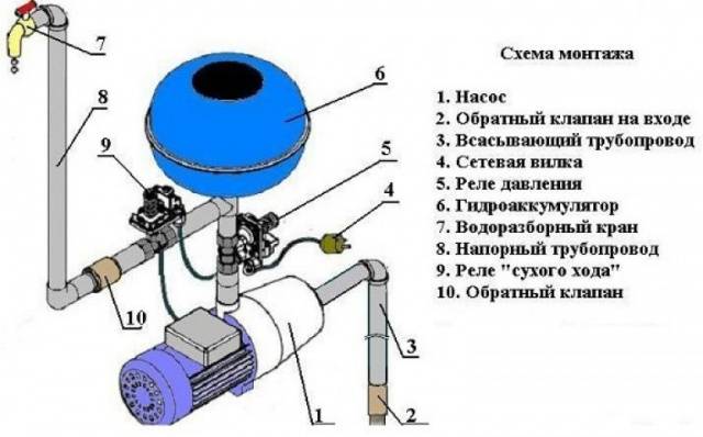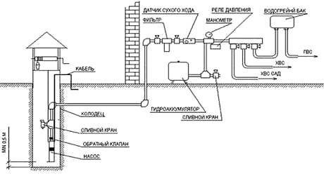 The assembly diagram of a system with a surface pump has several distinctive nuances. The entire chain of automation is recruited in the same way as for a submersible pump. But since the unit is installed near the well, a PVC water intake pipe with a diameter of 25–35 mm is connected to its entrance. A check valve is attached to its second end using a fitting, and then lowered into the well. The length of the pipe is selected so that the check valve is immersed in water to a depth of about 1 m, otherwise the pump will trap air.