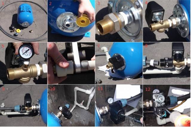 Work begins with piping the accumulator. According to the scheme, equipment is connected to it in turn. All threaded connections are sealed with fumulent. In the photo you can see the order of assembly.