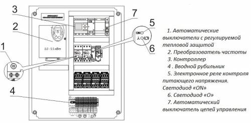 The automatic machines installed in the cabinet perform a smooth start of the engine. Easy access to the equipment allows you to adjust the frequency converter, measure the characteristics of the current at the terminals, and adjust the rotation speed of the pump shaft. If several wells with pumps are used, all control devices can be placed in one cabinet. The photo shows a typical layout of the equipment that might be in a cabinet.