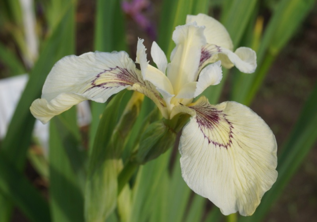 - Creme de la Creme. This is an unpretentious marsh iris, for its planting, you can choose wet, and even flooded places, shallow water. Looks good in partial shade, but it is in the sun that it reveals all its charm. The height of the bushes is 70-90 cm. The flowers are light cream with burgundy-purple veins at the base. The buds are large - about 10 cm in diameter.