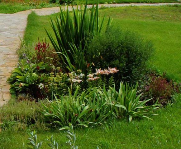 - on ponds, small lakes or wet beds, varieties of yellow marsh iris are placed in rows or curtains.