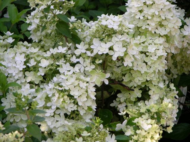 The shrub produces pyramidal panicles up to 20 cm long. The inflorescences consist of flat white flowers with a diameter of 3 cm. No fruits are formed after flowering. During the season, the flowers change color from cream to white, then become pink. At the end of flowering, the panicles become greenish-burgundy.