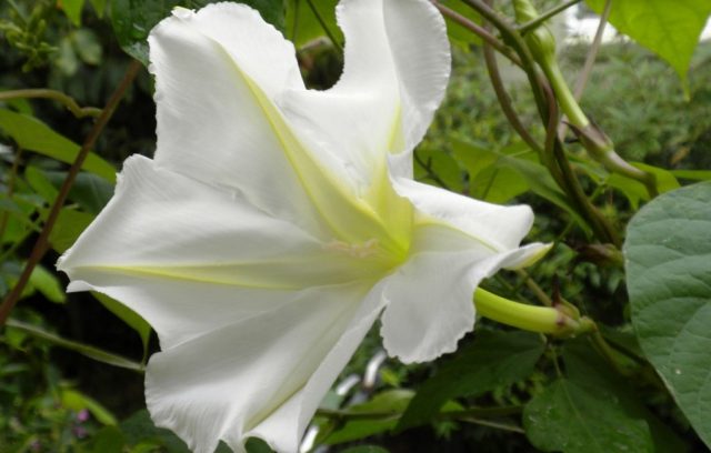 Late flowering variety with large, heart-shaped leaves of a pale green color. In July, 3-m shoots are covered with large snow-white flowers with a diameter of 10 cm. Flowering is one-day, but long. The buds open before the first frost. The variety is grown in hanging pots and used for vertical gardening.