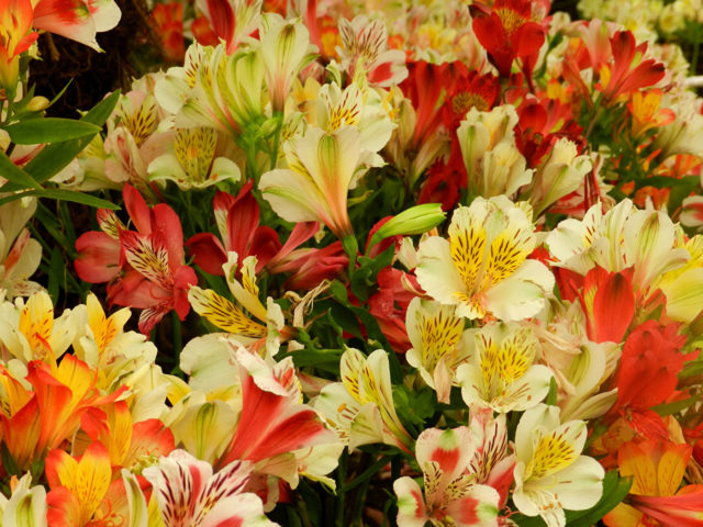 The flowers are six-petaled, red, pink, white, yellow, inner petals with a dark brown, randomly distributed blotch
