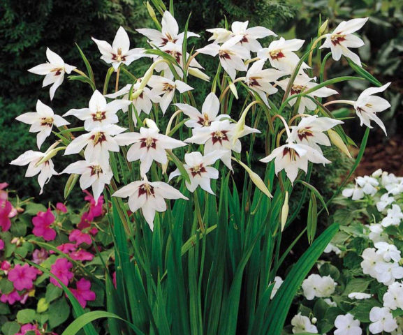 Acidanthera is a member of the Kasatik family. The flower is vaguely similar to irises, popularly called Muriel gladiolus because of the shape of the bush and long, narrow, linear leaves. Perennial corm plant, can grow up to 130 cm. Stems are thin, branched in the upper part. The petals are collected at the base in a long tube. The inflorescences are spike-shaped, the diameter of the flower is 10-13 cm. The color is light cream with a maroon core.