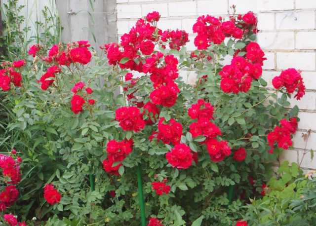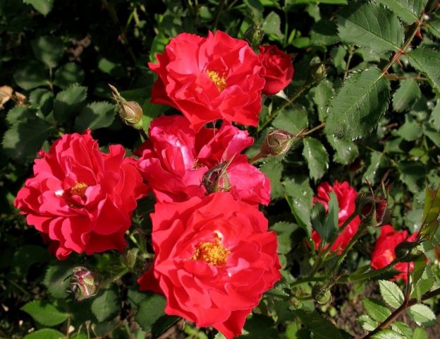 On each of the branches, from 3 to 5 buds of rich crimson or red shades are formed. Unusual for roses the appearance of flowers, they are semi-double, with pointed petals, which from a distance makes them look like a carnation. The diameter of each bud is 5-6 cm. Roses are characterized by a spicy aroma.