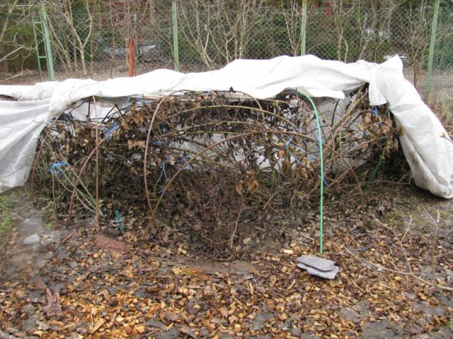 Before covering the branches with improvised materials (cloth or spruce branches), it is recommended to spud the plant