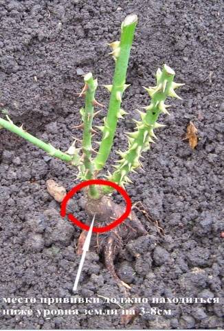 - The seedlings need to be buried 5-10 cm below the grafting, so that they better endure the winter. The soil around the bush is well compacted so that the roots do not end up in the air.