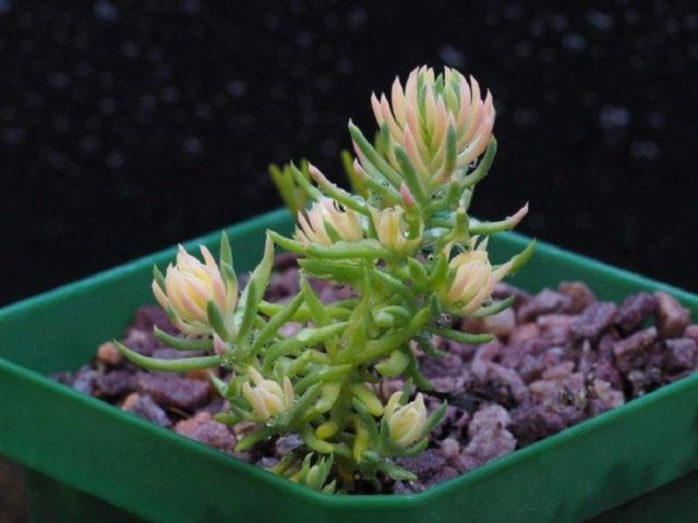 In the summer season, it is enough to water rock sedum as the soil dries out, 1-2 times in 4 weeks. Infrequent spraying is also allowed to remove dust from leaves. In winter, watering should be reduced as much as possible to 1 time per month. If the plant grows in the open field, then irrigation is not required in winter.