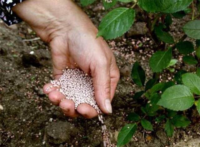 Fertilizers based on phosphorus and potassium are preferably applied twice: at the end of August and in the middle of September. For feeding shrubs, it is better to choose the dry method, that is, scatter the granules around the hydrangea bush. The amount of fertilizer depends on the size of the hydrangea bush: for large shrubs, you will need at least 2 handfuls of top dressing, for small ones, one is enough.