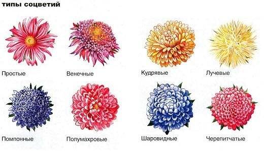The most complete picture of asters can be given by systematization by the type of inflorescences. In addition to the popular simple ones, there are the following types of flowers: